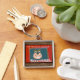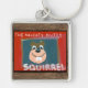 Um autorretrato bonito do esquilo malvado. Seu rosto engraçado sobre fundo verde e vermelho. Tipo pintura a óleo. Estilo moldado de madeira - Chaveiro.