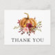 Obrigado seus convidados para comemorar! Neste obrigado temático de outono, você faz um cartão-postal com uma abóbora aquarela com belos florais de outono. Personalize com suas informações ou clique em "Clique para personalizar mais" para editar estilos de fonte, tamanho e cores. A mensagem no verso pode ser personalizada.