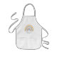 This kids' apron features a boho rainbow in muted pastel earth tones of gray, peach, green and gold. Personalize it with her name in gray handwriting script.