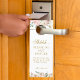 Um elegante buquê floral de peônias cor-de-rosa e rosas de marfim enquadra o guião de ouro neste adorável cabide de hotel para o seu fim de semana de casamento. A frente é uma mensagem padrão Não Incomodar para convidados dormindo e a parte traseira tem uma mensagem bem-vinda.