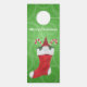Este cabide de porta de papel é verde com espirais com um gnomo vestindo um chapéu vermelho alto, dentro vermelho e branco estocado de Natal com canas doces e folhas sagradas. Personalize o texto Feliz Natal na frente e atrás com o modelo.