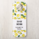 Um cabide de porta com um padrão fofo de limões amarelos com folhas verdes e fatias frescas de limão cortado.