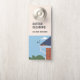 Door Hanger com uma ilustração de um telhado e sarjeta de uma casa e algumas folhas de queda, atrás de um céu azul, com uma nuvem. No verso, há uma lista de serviços e informações de contato. Pode ser utilizado para pequenas empresas, como limpeza ou reparação de telhados e calhas, manutenção de mão, serviço de lavagem de pressão, etc.
