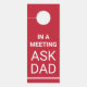 Não atrapalhe o cabide de uma porta para um pai que trabalha em casa. De um lado, "em uma reunião - peça ao pai" em texto branco contra fundo vermelho. Por outro lado, "Estou a trabalhar - bater antes de entrar" em texto branco, contra fundo verde.
