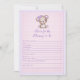Urso bebê marrom e roxo adorável para o chá de fraldas de uma menina. Aconselhamento para jogo de chá de fraldas de Mamãe. Cobertura rosa e roxa com borda roxa e pontilhada para fundo. Modelos fornecidas atrás.