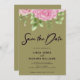 O convite personalizável "Salve a data" do Avocado com rosas com fundo preto e letra preto brilhante manuscrita. Este design apresenta belas rosas cor-de-rosa e uma grande fonte de estilo caligráfico que você pode mudar para qualquer outra cor que quiser. Você também pode personalizar todos os detalhes e cores de texto neste modelo Salvar Data.