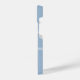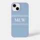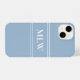 Esta capas de iphone azul bebê tem três letras brancas no centro. Você pode alterar as letras para exibir o monograma correto. Duas linhas brancas horizontais estão acima e abaixo das iniciais.