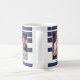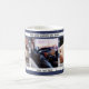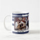 Uma caneca azul escura e branca listrada com suas próprias fotos. As imagens de fundo do texto podem ser excluídas se você não precisar delas. Excelente de aniversário ou Dia de os pais, por exemplo.