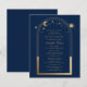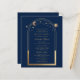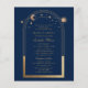 A Astronomia da Lua Solar Dourada Celestial Quinceañera Invisions apresenta um elegante sol dourado, lua e estrelas com um quadro de ouro sobre um fundo azul. Dentro é a sua informação de convite da Quinceañera. Personalize editando o texto nas caixas de texto. Projetado para você pelo Evco Studio www.zazzle.com/store/evcostudio