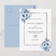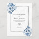 Na frente: Um clássico fundo branco chic com uma falso quadro prateado. Decorados com flores aquáticas, florais em tons de azul. Modelos para os nomes da noiva e do noivo e detalhes da festa. O texto é escrito com letras coloridas a preto. Fundo: fundo azul empoeirado. Dica: Se você não quiser que pareça um cartão postal, clique em personalizar, vá para o verso e remova o divisor e o carimbo de posto.