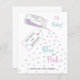 Um amor azul e cor-de-rosa, um gênero de confete de coração revela convite. A design consiste de um vidro decorativo que lê caseiro com amor. O pote está cheio de elegantes confetes azuis e cor-de-rosa amados em forma de coração, que cai na frase azul ou rosa o que você acha? O rótulo do frasco contém um pé de bebê rosa e azul, e lê Baby your Surname (Bebê, seu sobrenome, pequeno gênero) revela.