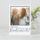 Esta é uma modelo de cartão de proposta moderna e elegante "Will You Be My Bridesmaid". O design apresenta uma foto de solteiro com um contorno azul e uma tipografia. Há espaço na parte traseira desta placa para uma mensagem especial, ou você pode excluir e adicionar uma nota escrita à mão.