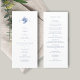 Chic com elegância jovem. Este doce cartão azul e branco do programa de casamento exumenta um tom fresco, moderno e jovem. A frente do cartão inclui um conjunto contemporâneo de fontes em um monograma azul empoeirado e elegante de casal floral, contra um fundo branco nítido. Estão incluídos os obrigados que você envia, a ordem da cerimônia e a sua própria lista de festas de casamento no verso.