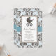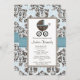 Convites azuis e marrons bonito do chá de fraldas do damasco com um design da fita do ponto do contraste e uma carruagem de bebê do marrom escuro com guarnição azul. Trabalhos de arte e © Chrissy H. Estúdio do design, LLC. Todos os direitos reservados.