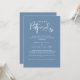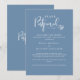 Tiveram que adiar o casamento? Sem problemas, informe os convidados com este elegante Cartão de Anúncio de Atraso de Casamento. Possibilidade de ter texto com os pais informando familiares e amigos ou casal enviando a mensagem. Design azul empoeirado e branco com detalhes de caligrafia moderna manuscrita. Possibilidade de alterar a cor do fundo para outra cor que preferir, selecionando personalizar.