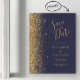 A borda esquerda deste elegante casamento moderno, exceto a data em que o cartão magnético apresenta uma borda falsa dourada. O texto personalizável combina manuscrito pálido de cor dourada, fontes copperplate e itálico em um fundo azul escuro.