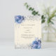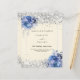 Um fundo colorido creme decorado com rosas azuis, flores e falso confete prateado. Personalize e adicione seus nomes e detalhes do casamento. Letras negras. 1 folha = 1 convite impresso de borda a borda.