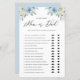Adivinha quem? Mãe ou pai? Adicione este cartão de jogo de chá de fraldas botânico divertido ao seu evento. Apresenta ilustrações de cor d'água de rosas e peões esbranquiçados e azuis com sotaque verde. Personalize adicionando textos de volta. Este cartão floral de adivinhação é perfeito para o inverno e é um chá de fraldas Boy.