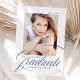 Anúncio de graduação elegante com a fotografia do mais velho do formando e uma fonte moderna de caligrafia do marinho. Personalize os anúncios de graduação de fotos adicionando o nome do formando, o nome da escola e o ano de graduação. A parte de trás do anúncio de graduação apresenta um marinho na moda e um padrão de listas brancas.