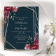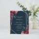 Convite personalizável de casamento em papel de barato em azul marinho profundo. Possui buquês florais bonito em tons burgundy profundos e ricos, com uma estrutura geométrica de ouro moderna.