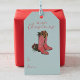 Este slogan de presente To/From, apresenta um par desenhado à mão de botas de natal de vaquinha sentadas entre pinecones, pínus e bagas ocas na frente. A parte de trás apresenta um padrão divertido com estes mesmos elementos ocidentais. Fundo azul macio legante.