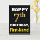 Este simples design de cartão de saudação com tema de aniversário apresenta um desejo de aniversário quente como "FELIZ 7 BIRTHDAY, First-Name!" na frente, em texto a negrito sobre fundo preto. O número de aniversário tem uma aparência falsa e imitada de cor dourada. O nome na frente pode ser personalizado. O dentro apresenta uma mensagem de aniversário que pode ser personalizada. Um cartão de boas-vindas como este poderia ser uma maneira divertida de fazer votos de aniversário a alguém que comemora seu sétimo aniversário. [~Z0000275]