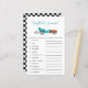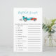 Tema do carro de corrida divertido Carro do chá de fraldas, placa de palavras de bebê apresentando a ilustração aquarela de um carro vintage azul com a arte da chama vermelha. A lista de palavras neste cartão estão todas relacionadas a bebês e elas estão embaralhadas. Os hóspedes vão competir quem pode desembaraçar todos eles primeiro! CHAVE DE RESPOSTA: 1. cadeirinho 2. leite 3. caneta de recreio 4. pacificador 5. fralda 6. cadeira de balanço 7. berçário 8. baby monitor 9. pastilha 10. fórmula 11. rolete de borracha 12.