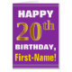 Este simples design de cartão de saudação com tema de aniversário apresenta um desejo de aniversário quente como "FELIZ 20 BIRTHDAY, First-Name!" na frente, em texto a negrito sobre fundo de cor roxa. O número de aniversário tem uma aparência falsa e imitada de cor dourada. O nome na frente pode ser personalizado. O dentro apresenta uma mensagem de aniversário personalizável. Um cartão de boas-vindas como este poderia ser uma maneira divertida de fazer votos de aniversário a alguém que comemora seu vigésimo aniversário. [~Z0000277]