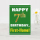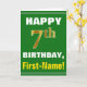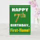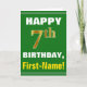 Este simples design de cartão de saudação com tema de aniversário apresenta um desejo de aniversário quente como "FELIZ 7 BIRTHDAY, First-Name!" na frente, em texto a negrito sobre um fundo de cor verde. O número de aniversário tem uma aparência falsa e imitada de cor dourada. O nome na frente pode ser personalizado. O dentro apresenta uma mensagem de aniversário que pode ser personalizada. Um cartão de boas-vindas como este poderia ser uma maneira divertida de fazer votos de aniversário a alguém que comemora seu sétimo aniversário. [~Z0000279]