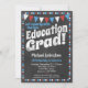 Um convite especial e único para a festa de formatura educacional em estilo 'chalkboard' com bandeiras vermelhas, brancas e azuis e uma borda galopante com pontos nas costas.