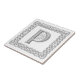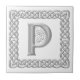 Este azulejo temático celta do trivet caracteriza o knotwork celta intrincado em um efeito de prata protegido. Uma beira quadrada do knotwork encerra uma grande inicial ou monograma capitalizado P. Um elemento decorativo maravilhoso para indicar sua herança cultural celta escocesa, irlandesa, de Galês, Cornish ou francesa dentro de seu casa ou escritório. Este azulejo versátil pode igualmente ser moldado, ou feito em uma caixa do trinket ou da lembrança.