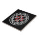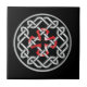 Um azulejo cerâmico com design de nó celta com uma cruz quadrada vermelha no centro.