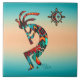 Brilhe a sua casa com este Azulejo único de "um tipo" do sudoeste de Kokopelli! Ele apresenta um Kokopelli sudoeste tocando flauta e dançando sob o sol em um fundo de turquesa e sunset laranja! Este é um Design de Arte Original "Um dos Tipos" do Artista Kerry Miller.