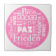 O azulejo cerâmico mostra a Peace Paz Pax multilíngue. Este é um design de paz de vários idiomas que eu atualizei recentemente de um original que eu criei há cerca de 25 anos. Ficou famoso em crachás de botão e postais, assim como camisas. O original foi criado em Letraset - se alguém se lembra disso? Agora disponível novamente em uma variedade de estilos de imagem para o século 21rua!! Educação, bem como prática, e um design impressionante! O que não gosta? : )