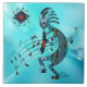 Brilhe a sua casa com este Azulejo único de "um tipo" do sudoeste de Kokopelli! Apresenta uma Turquesa do Sudoeste, Branca, Dourada e Rust Kokopelli tocando flauta e dançando sob o sol em um fundo turquesa de espiral... cercado por notas musicais! Este é um Design de Arte Original "Um dos Tipos" do Artista Kerry Miller.