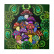 Um azulejo com os cogumelos psicadélicos coloridos cercados por paisley verde e por mandalas verdes.