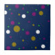 Um padrão de círculos de vários tamanhos em ouro, branco, roxo e verde está espalhado sobre um fundo azul escuro. Os círculos são espaçados uniformemente e variam de diâmetro.