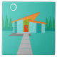 Este azulejo da casa dos desenhos animados da era espacial é o sonho retro de um amante vem verdadeiro. As características de design minimalistas da arte uma casa com grande, janelas da pedra do aqua do azul de pavão. Pendurando do atômico, inclinando, o telhado alaranjado, um dispositivo elétrico claro amarelo de sputnik ilumina a porta da rua. A porta da rua vermelha recessed com doorknob do starburst é deslocada belamente pelas pranchas de madeira verdes verticais da entrada exterior. Um trajeto de pedra cinzento corta através do gramado como novo, que aparece turquesa no luar. Atrás da casa, uma fileira de um alto, fina, árvores aponta ao céu de turquesa e à silhueta branca de uma Lua cheia. Quando nenhuma pessoas for visível, em uma noite como esta, os habitantes da casa kitschy são provavelmente metragem de notícia de observação interna dos astronautas.