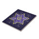 Este azulejo bonito caracteriza um Magen David intrincada tecido nas matiz de azul e de amarelo, em um campo de estrelas menores. Fundo azul escuro.