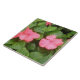 Este incrível azulejo apresenta uma fotografia de duas bonito flores cor-de-rosa impacientes e a folhagem circundante. As pétalas brilham e as folhas estão molhadas por uma tempestade.