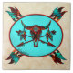 Aproxime sua casa com este único "Um dos tipos" crânio de Buffalo e lança Azulejo cerâmico! Ele apresenta um crânio nativo americano de búfalo e setas com penas em um fundo de turquesa... cercado por uma borda sudoeste em Turquesa, Laranja e Chamas Negras! Este é um Design de Arte Original "Um dos Tipos" do Artista Kerry Miller.