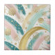 Um azulejo de cerâmica abstrato, brilhante e colorido, com pinceladas inspiradas no arco-íris em pastéis macios — cor-de-rosa, verde-menta, azul-claro e amarelo-claro — acentuado com texturas douradas brilhantes, estrelas dispersas e detalhes pontilhados. Ideal para amantes da fantasia, estética do sonho e vibrações sazonais alegres como primavera, verão, aniversários ou comemorações do orgulho.