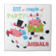 Aqui está um azulejo de cozinha divertido e colorido que mostra duas vacas de desenho animado "animais de festa". Um está vestido com uma camisa tropical de verde limão e flor de laranja. A outra veste um chapéu preto e sopra um barulhador. O texto estilizado diz "Apenas um casal de ANIMAIS DA FESTA". As cores utilizadas incluem rosa, azul, verde limão, preto, branco e laranja. Bonita! *O Clip art usado neste design é protegido por direitos autorais pela Encore Software, Inc., que permite o uso a seus licenciadores. Todos os direitos reservados.