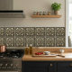Add a touch of celestial charm to your decor with this stunning Art Deco ceramic tile. The design features a captivating central starburst motif surrounded by intricate geometric patterns in rich navy blue, deep green, and radiant gold. The interplay of sharp lines and curves, set on a classic ivory backdrop, creates a visually dynamic and elegant statement piece. This tile is an ideal choice for those looking to infuse their living spaces with a sense of historical grandeur and artistic flair, perfect for accent walls or backsplashes.