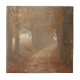 Fotografia da floresta do outono de árvores que atravessam o caminho da madeira com uma neblina de luz amolecendo a imagem.