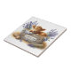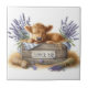 This ceramic tile is shown with a cute baby cow cozy in a farm crate with lavender art print.