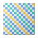 A colorful checkered pattern with alternating blue, green, and yellow squares on a white background. The design is vibrant and geometric, creating a playful tone.