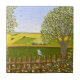 A ceramic tile with a beautiful image of a nature scene: A bird sitting on a weathered fence, wildflowers growing around the fence, a farmer on a tractor, working his land, trees with leaves, and farmland with various colors. Original artwork by W.B.