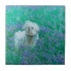 Azulejo cerâmico decorativo impresso com uma ilustração colorida de um Bichon Frisé num campo de bluebonnets. Trabalho de arte: lápis colorido no painel. Copyright: Dominic White. Todos os direitos reservados.