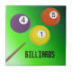 Um legal design para a sala de piscinas. Três bolas de piscina em roxo, laranja e amarelo com uma piscina no canto. Um fundo verde sombreado...